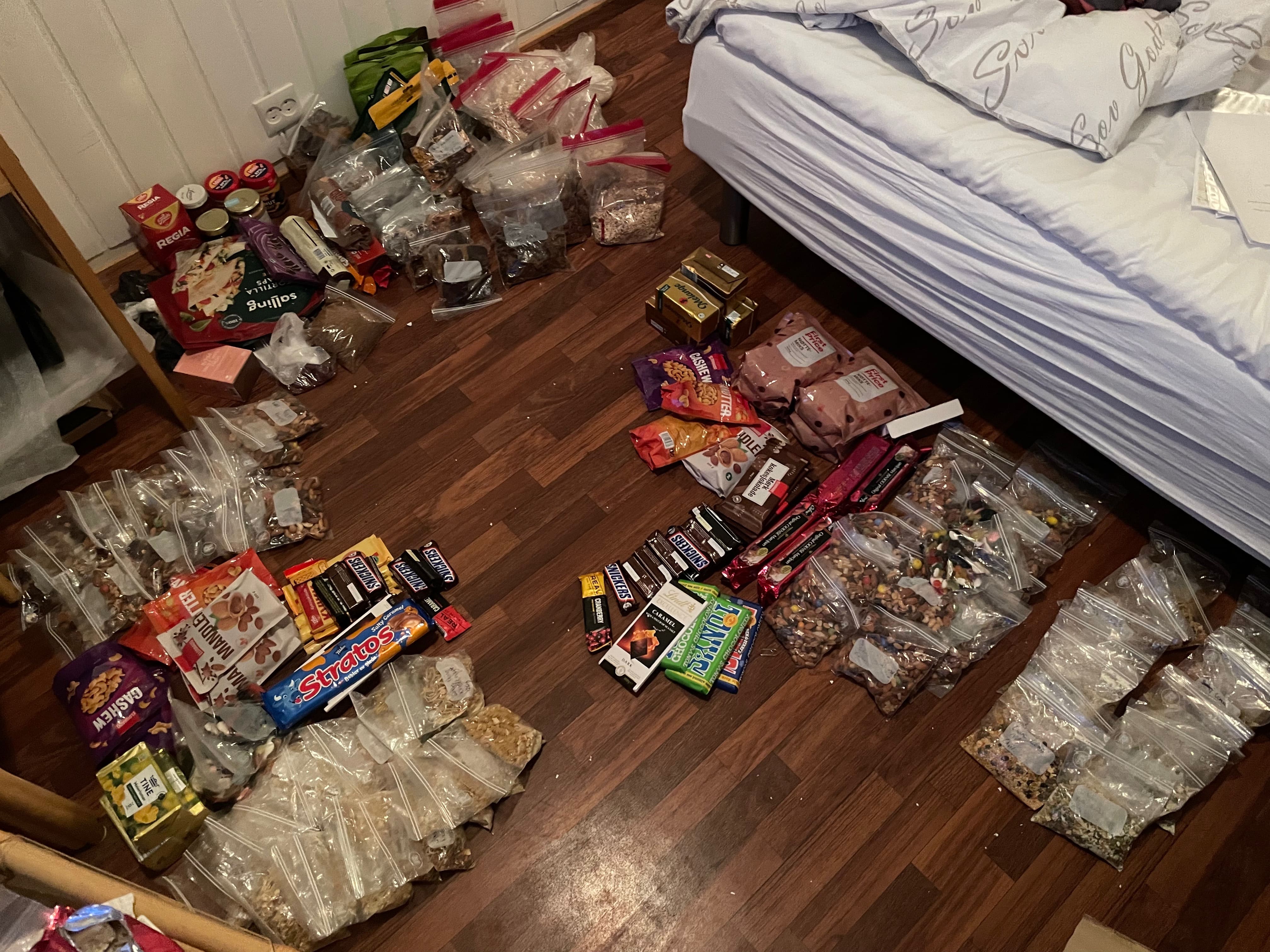 - 100g hjemmelavet kage: Vi bagte store portioner af snickerskage, Svalbardbrownie, sirupskage, og havregrynskugler. Fungerede fantastisk i kulden, mega lækkert, relativt billigt, og super nemt at lave. Havregrynskuglerne kunne måske med fordel have været lavet som et større stykke kage i stedet for at trille små kugler. Blev skåret i 50g stykker og opbevaret i fryser indtil depotkassen skulle sendes. Opskrifterne kan ses længere nede på siden.