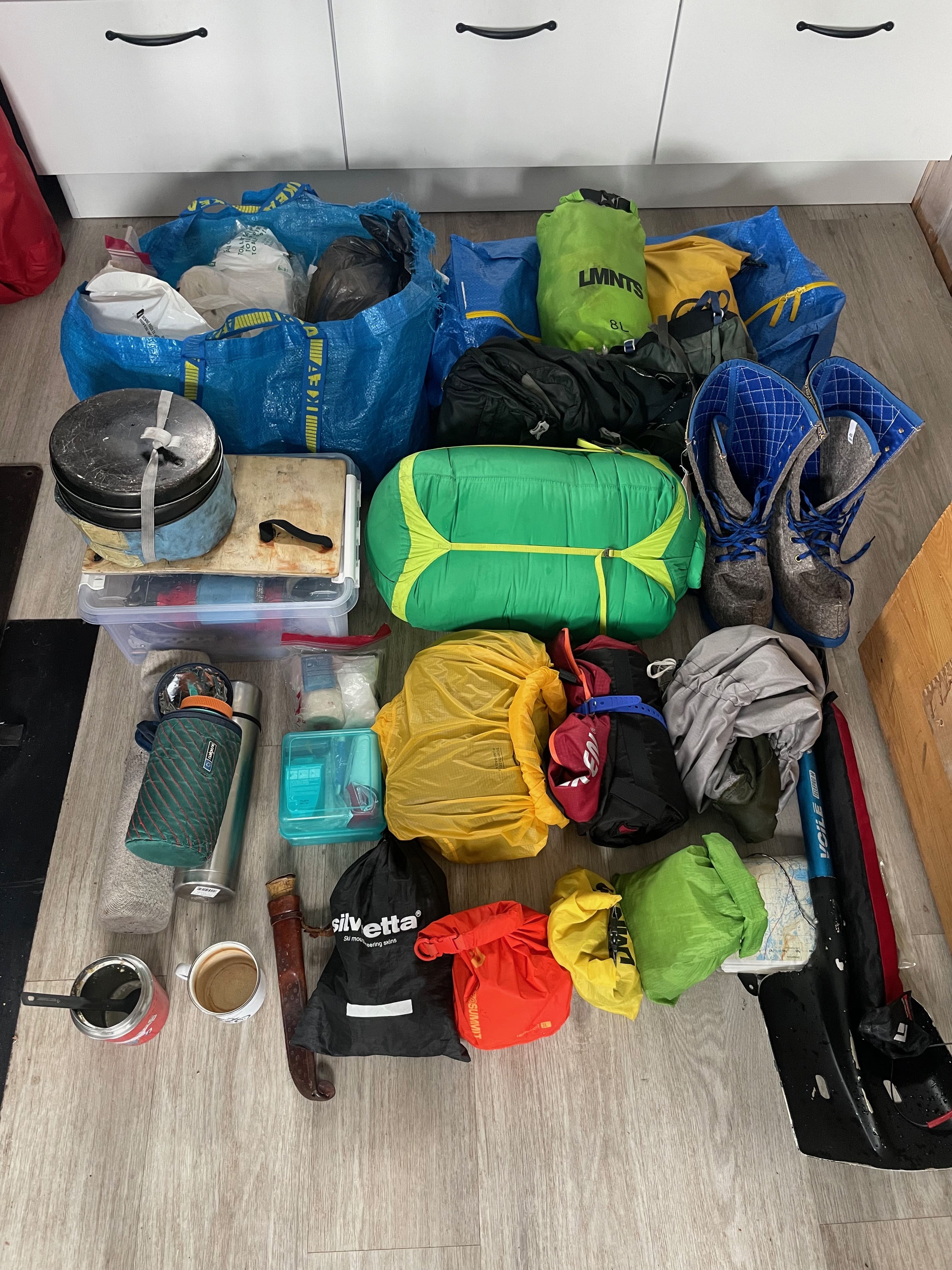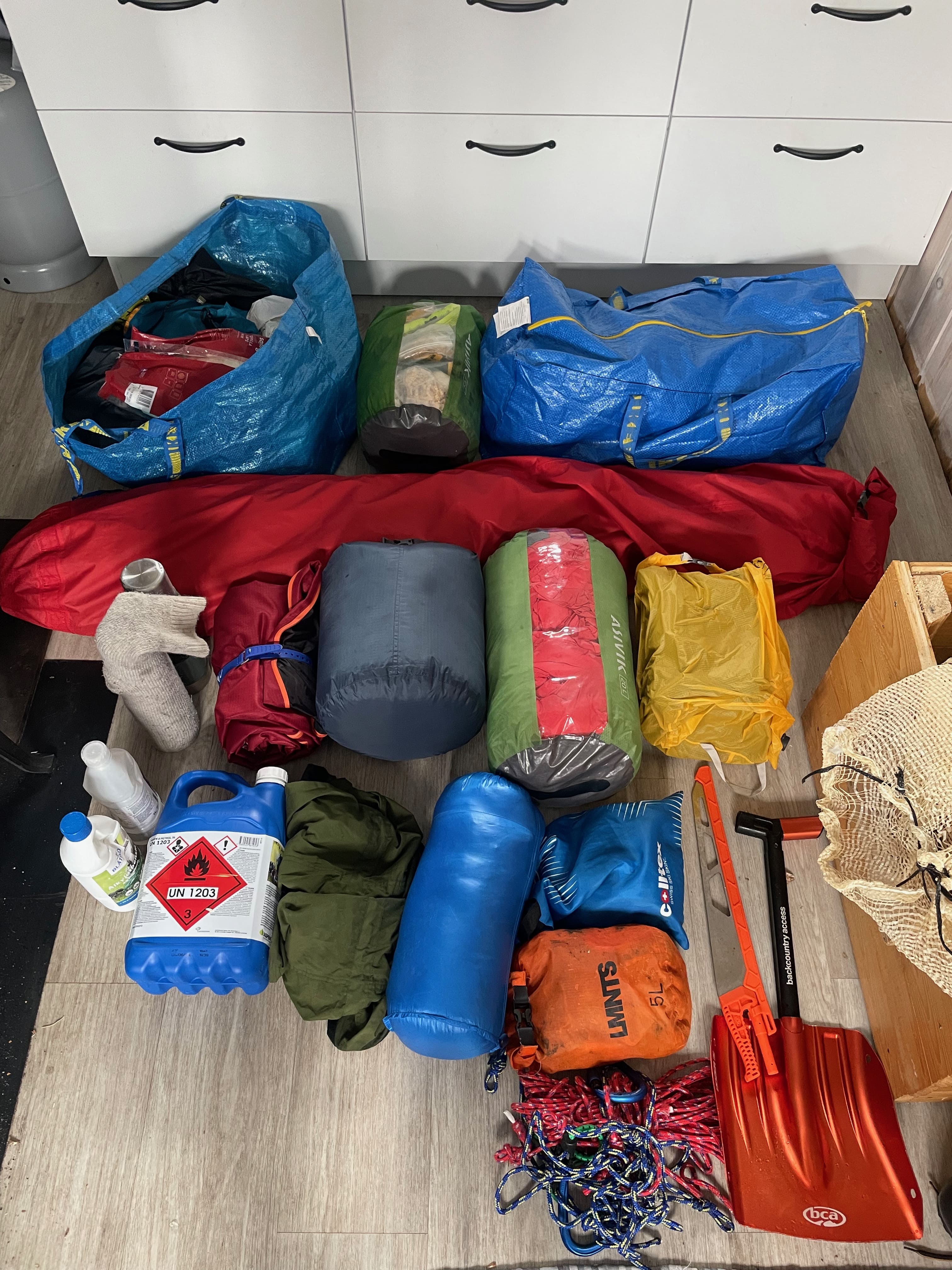 - Telt: Vi brugte Hilleberg Kaitum 2 GT fordi det er det vi har. Det gik fint, men vi anbefaler at vælge et større telt til 3 eller 4 personer, hvis du skal ud og investere i et. Det giver meget mere plads til grej og kose-fyring mm. Skal vi have nyt, vil vi også vælge deres black-label (fx Keron GT) for endnu større sikkerhed i vinterstorm. Alternativt kan man nøjes med at opgradere til et tykkere sæt teltstænger, eller tage et ekstra sæt teltstænger med til Kaitum (kanalen til teltstænger er bred nok til at sætte to sæt i). Men overordnet var vi utroligt glade for vores telt og hvor godt det holdt! Vi var meget glade for at have to indgange, så vi kunne have køkkenet i den ene ende, og pakke grej ind og ud fra den anden.